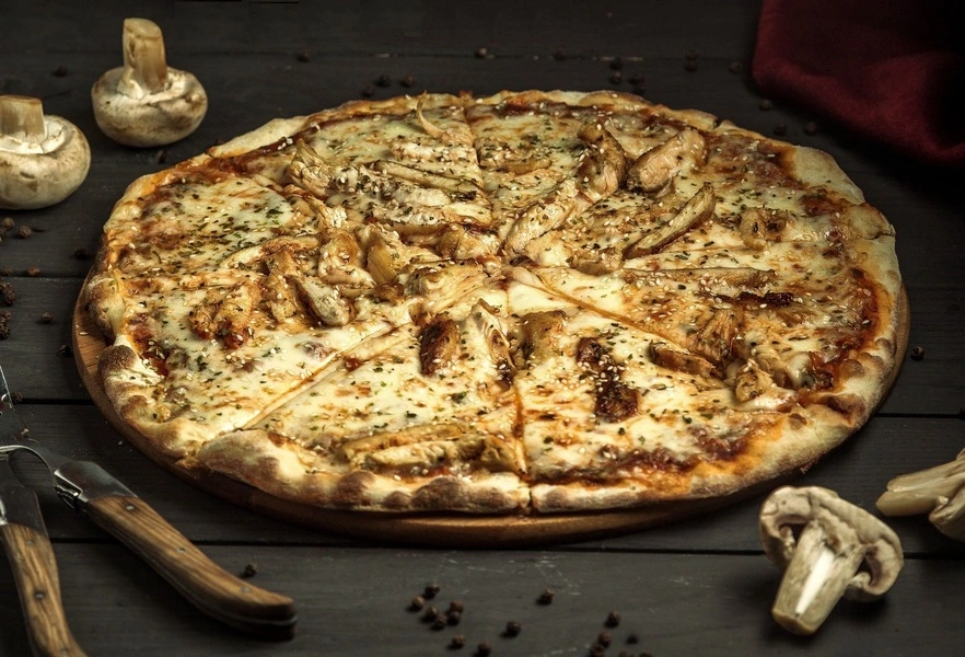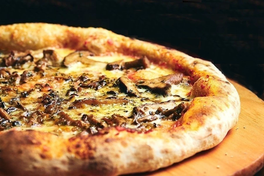 Pizza Ai Funghi is a variety of Italian pizza that is traditionally topped with tomato sauce, mozzarella cheese, mushrooms porcino, oil, and parsley.