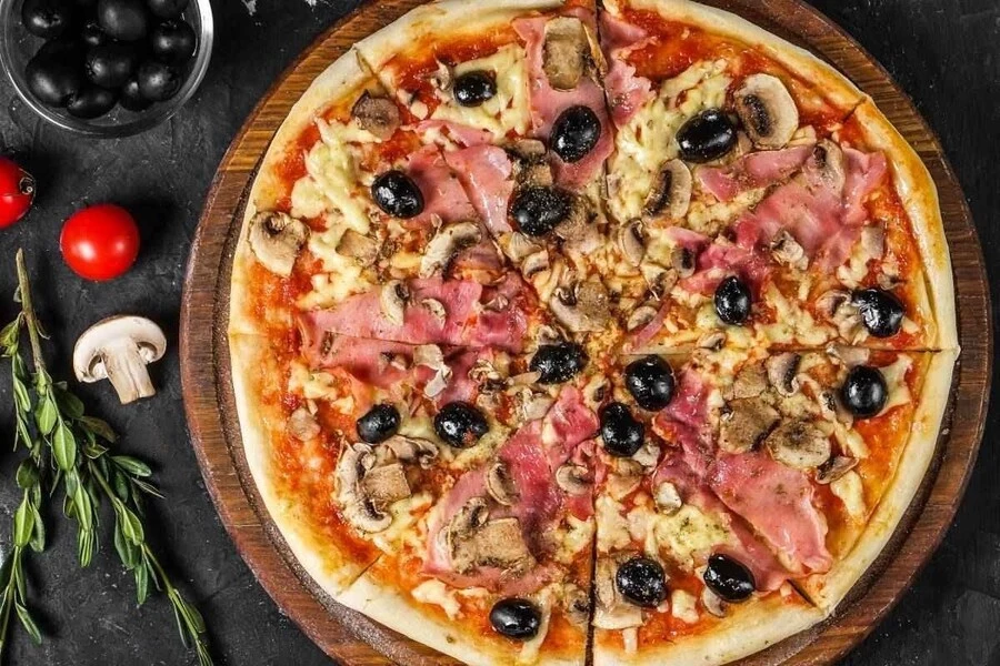 Pizza capricciosa is a style of pizza in Italian cuisine prepared with mozzarella cheese, Italian baked ham, mushroom, artichoke and tomato. edible mushrooms used may include cremini (white mushrooms) and others some version of capricciosa may also use prosciutto (a dry-cured ham), marinated artichoke hearts, olive oil, olives, basil leaves.